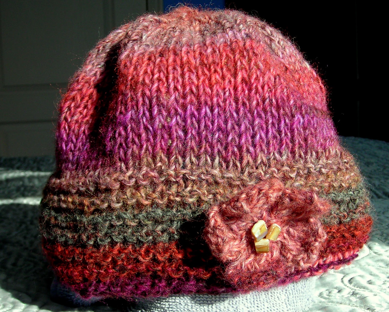 Next was finding the perfect pattern. I hunted around online and settled on a pattern for a mohair hat that I kinda liked. The Amazing yarn had a fuzzy-ish quality to it that I thought would work with this pattern. However, the pattern (as most on the Head Huggers site) didn't have a gauge. It called for fingerling mohair yarn on size 8 needles, and I had worsted-weight yarn. I tried a swatch on size 8s, but decided I'd rather go for an airier knit, so I switched up to size 11 needles. I went to my trusty pattern book, checked my gauge, and went for a 21 inch circumference on the hat. I started with very loose tension, and the way it bunched up on the circular needles, it felt like it was going to be huge. After I had knit several inches, it was clear that it was going to be huge, so I ripped it out and started again, casting on 10 less stitches this time. It felt a little better, and I made sure to keep more tension as I knit. With those fat needles, the knitting was still plenty loose, resulting in a pretty floppy hat. The pattern called for a loopy flower to go on the top of the hat, but I looked through the flower patterns on the site, and found a different one I liked better. The way you knit it is pretty cool -- you do the tips of each of 5 petals separately, leaving them on the needle but cutting the yarn and casting on a new petal each time. Then, instead of cutting the yarn on the last petal, you knit across all 5 petals, and then start decreasing, bringing them all to a center point. You also knit the ends of the tails in as you go, so there's no weaving-in to do at the end -- very handy! The examples they used were pressed or blocked to flatten them, but I liked the 3-D effect of the curly petals, so I skipped that step. Then you sew three beads into the center of the flower. I went through my bead collection and found three mother of pearl chunks that I used instead -- they are less delicate, but I like the iridescence, and I like the contrast of square beads on the soft, curled petals.